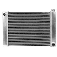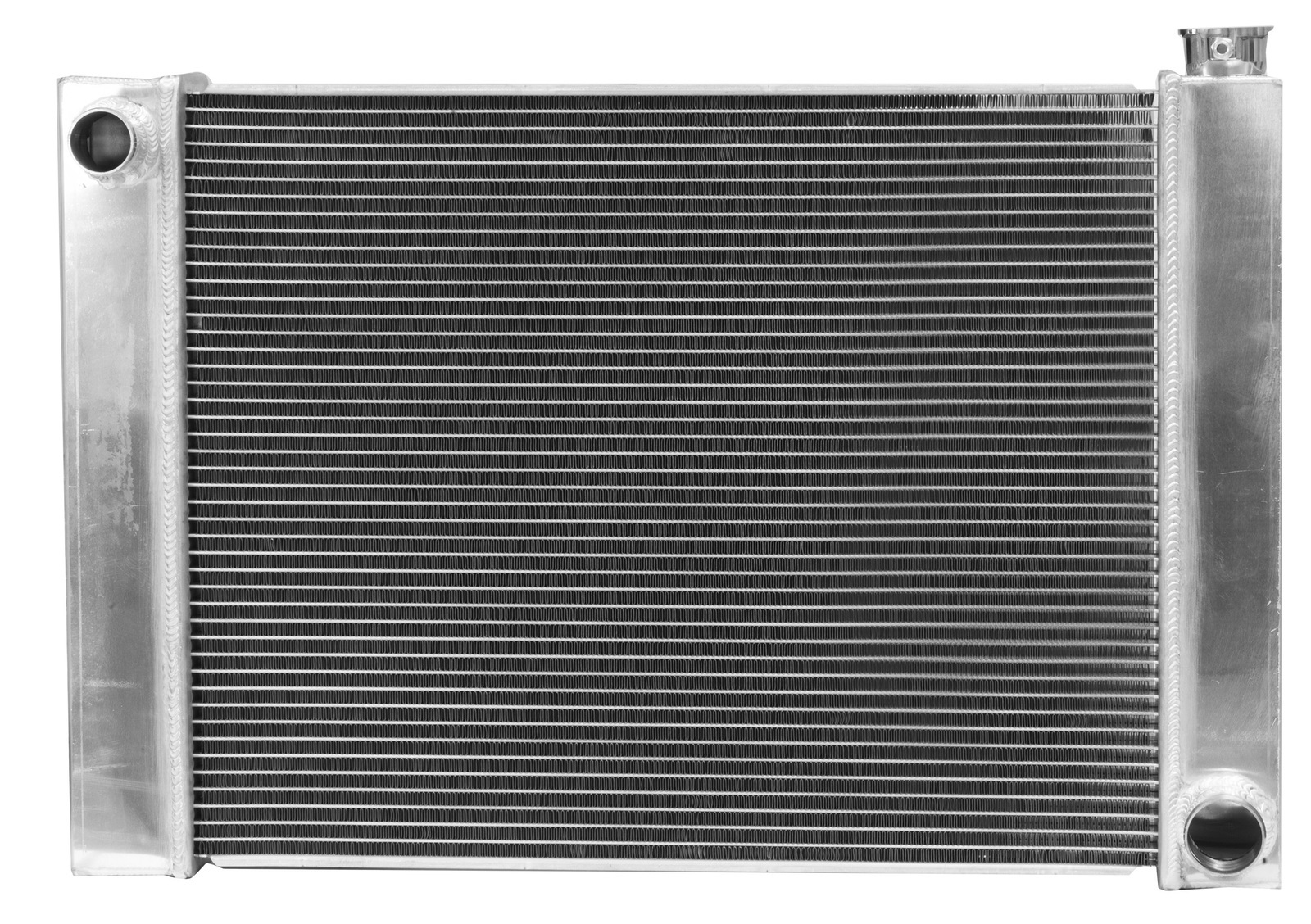 Proflow's Ultra Cool universal aluminium radiators cool more effectively and weigh less than older OEM style brass units. They come completely TIG welded with a show-car polished finish and are available in a variety of sizes for both Chevrolet and Ford applications. Features: 100% TIG welded construction including end tanks 50 mm aluminium core, fittings and tanks (up to 30% weight savings to stock tanks) Billet aluminium filler neck and OEM style brass petcock More fins per inch (FPI) for greater cooling effect 3-row radiators supporting applications with 450-750 HP Note: Total width includes tanks. Inlet 1.5", outlets 1.75".