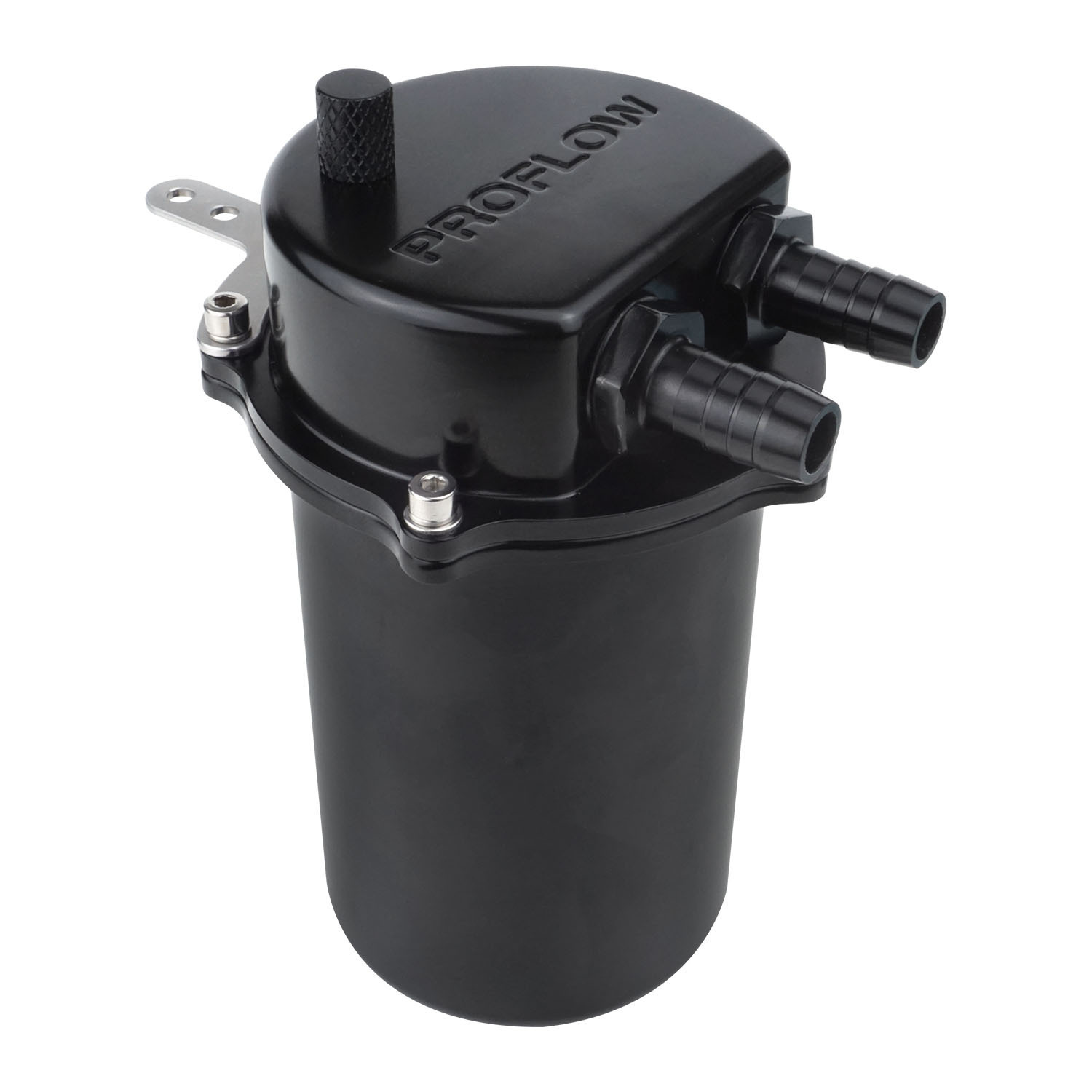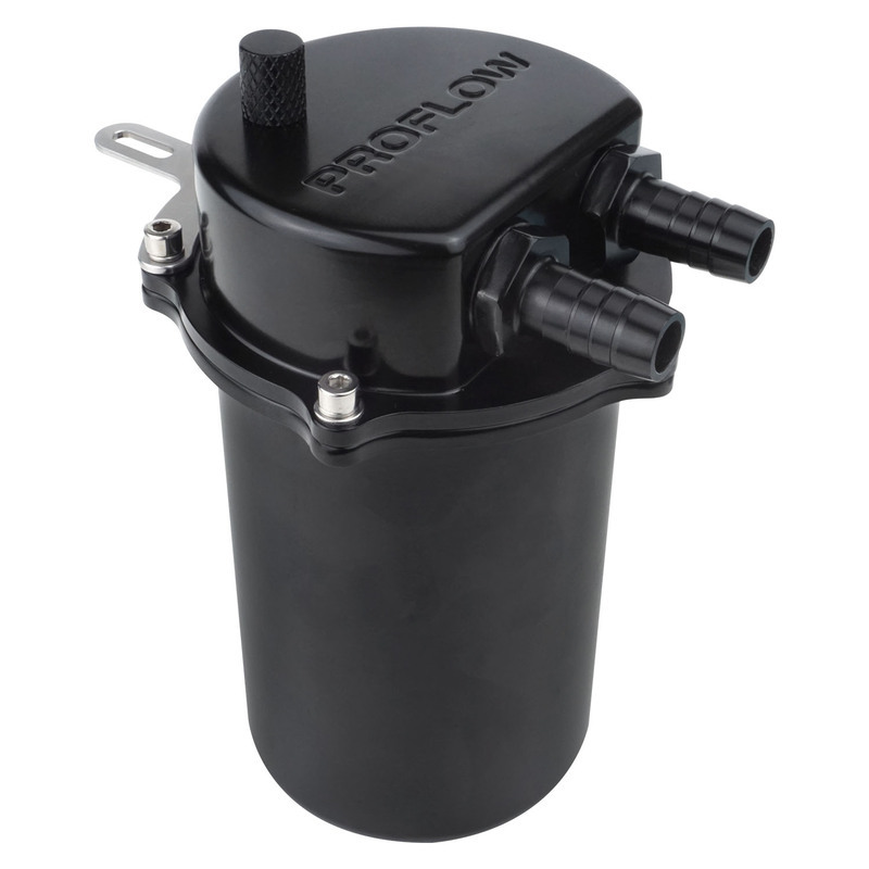 Proflow's universal oil catch can system traps excessive crankcase oil vapors and gunk from entering the engine and intake tract, usually caused by engine blow-by. This helps to reduce carbon buildup on the back of intake valves, reducing airflow and hurting engine performance. It features a thoroughly tested internal baffling system which divides the inlet and outlet of the catch can, seperating oil particles from the fresh air which is then re-routed back into the intake tract. This was validated with the use of CFD software, in an aim to slow down air speed through the catch can to give it enough time for oil & moisture to condense and cling to the baffle plates. It is easily emptied by unscrewing the -08AN fitting plug, while the dipstick included makes for easy oil level checking. This catch can design is completely legal for road use as it is fully recirculating and there is no venting to atmosphere. Its compact body makes it easy to be mounted in the tighest of engine bays and is perfect for any diesel 4WD's, V8's, straight sixes and 4-cylinders, holding up to 500mL of oil. This kit also comes with 2x hose clamps and 2 metres of our SAE certified 1/2" push-on hose. If using with E85 for track use, we recommend checking the oil level more regularly due to the chance of condensation building up in the can.